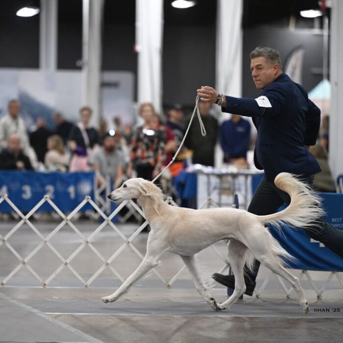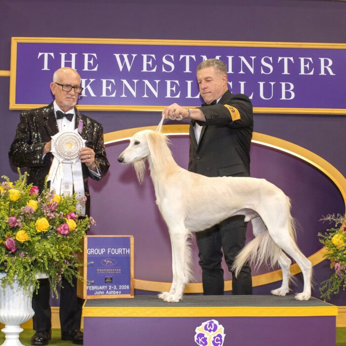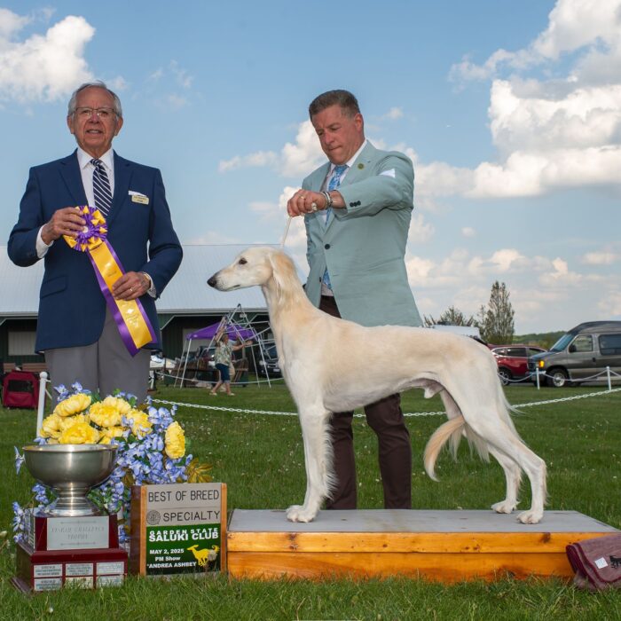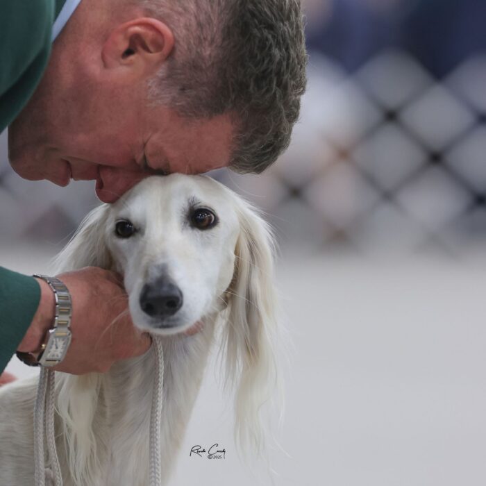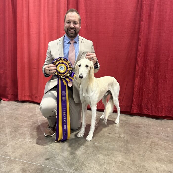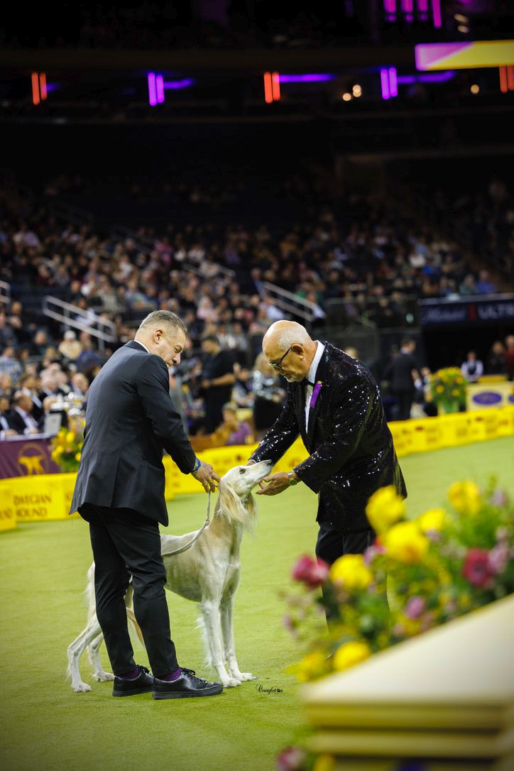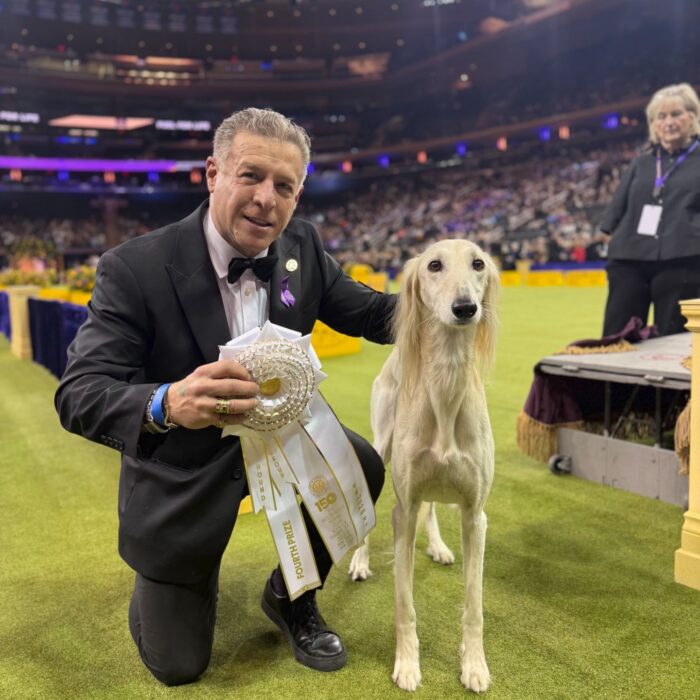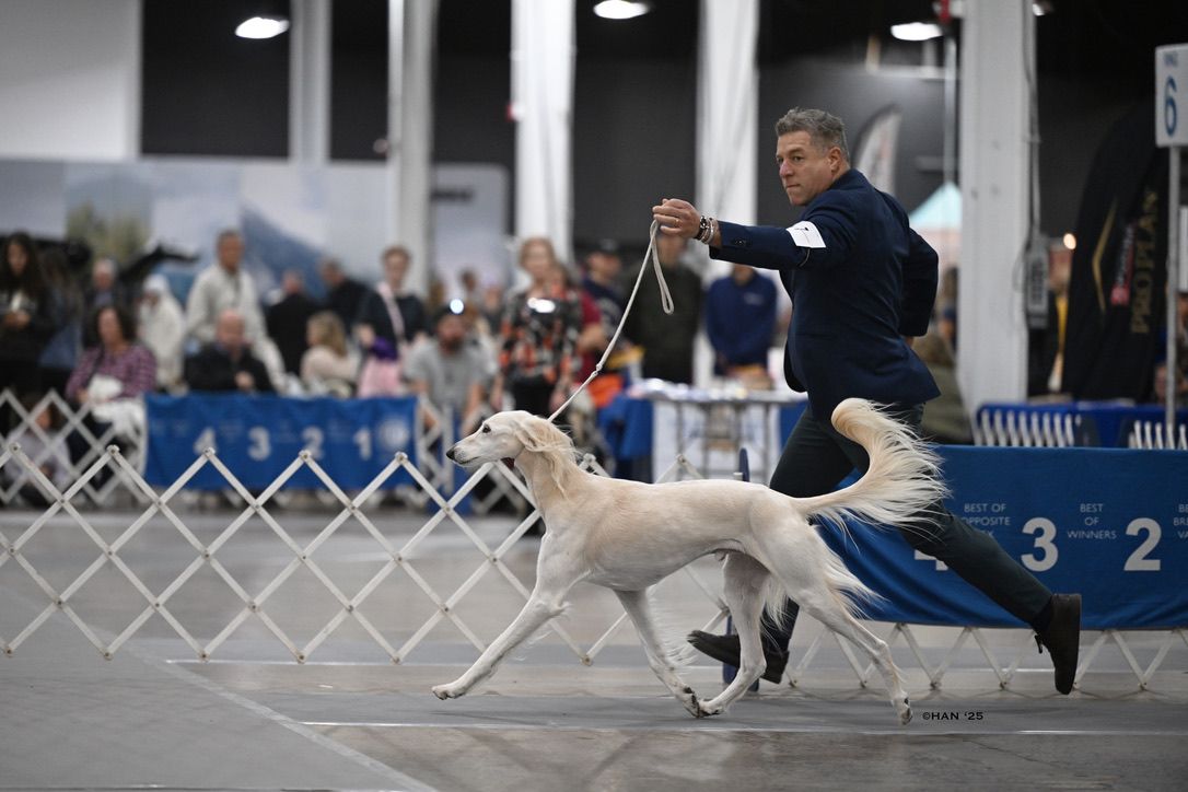 Since then, Kaspian has gone on to win many Specialty Best of Breeds and an all breed Best in Show and was the number one male saluki in the US in 2025 — as a veteran no less! In February of 2026, Kaspian was Best of Breed at the Westminster Kennel Club under breeder judge David Miller and then went on to win Group 4 under Michael Canalizo — under the lights at Madison Square Garden, one of the greatest thrills and honors ever!
