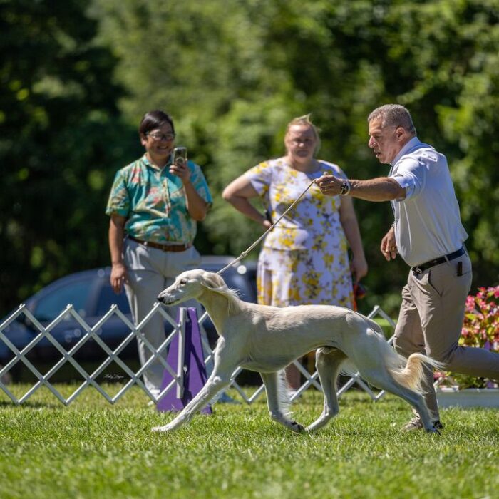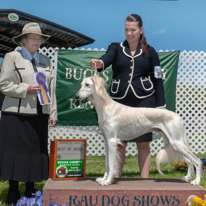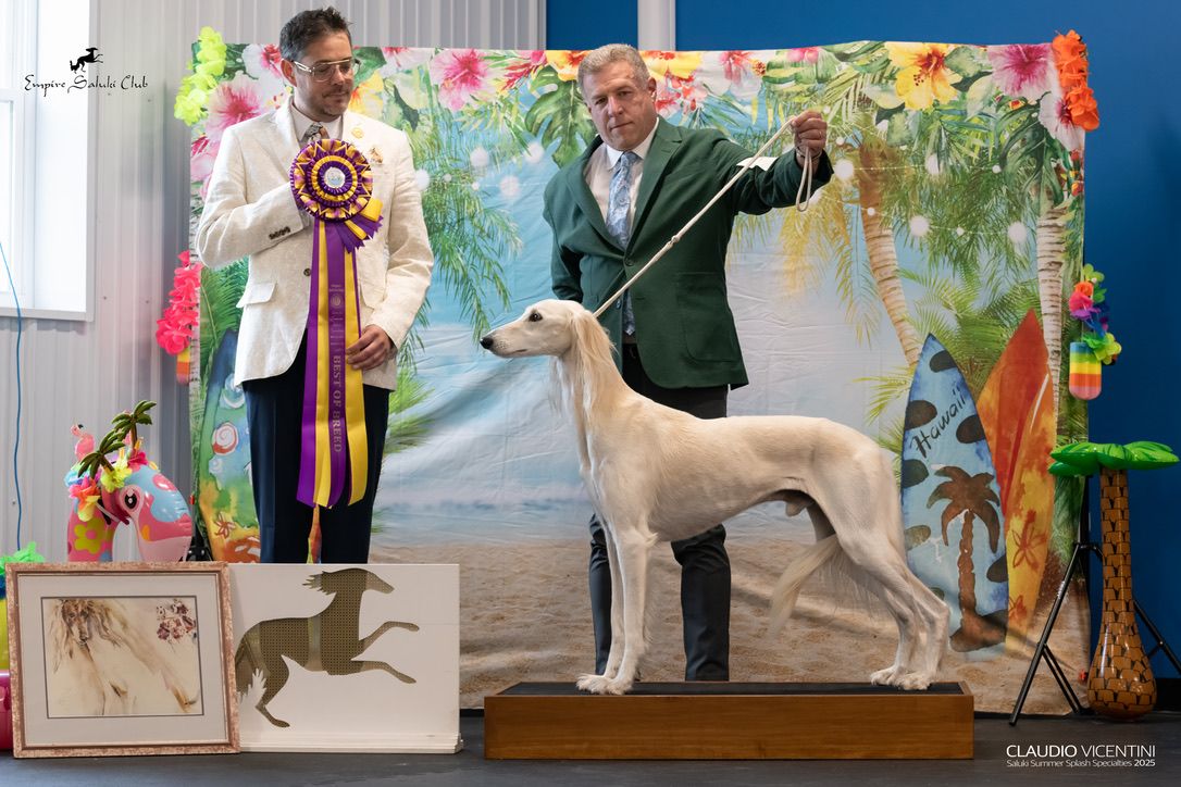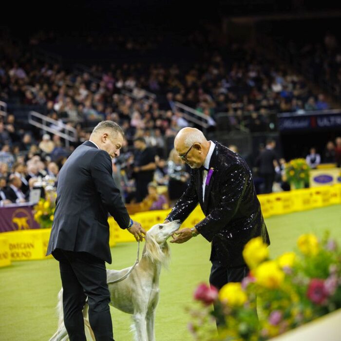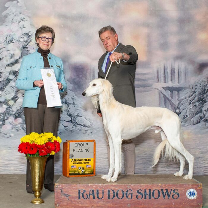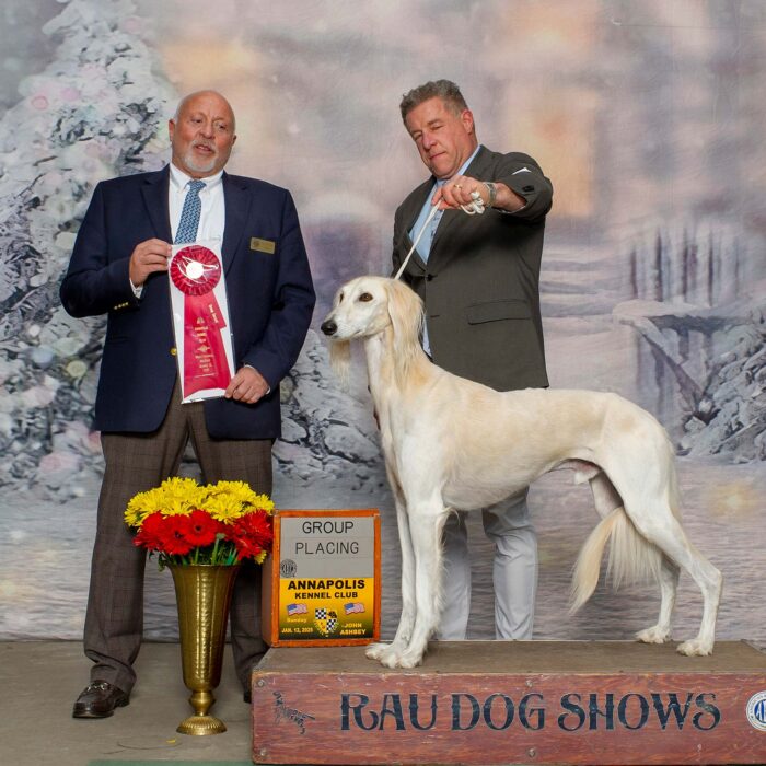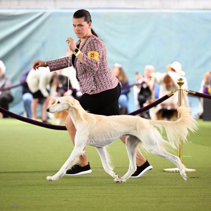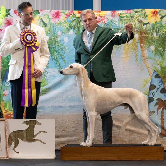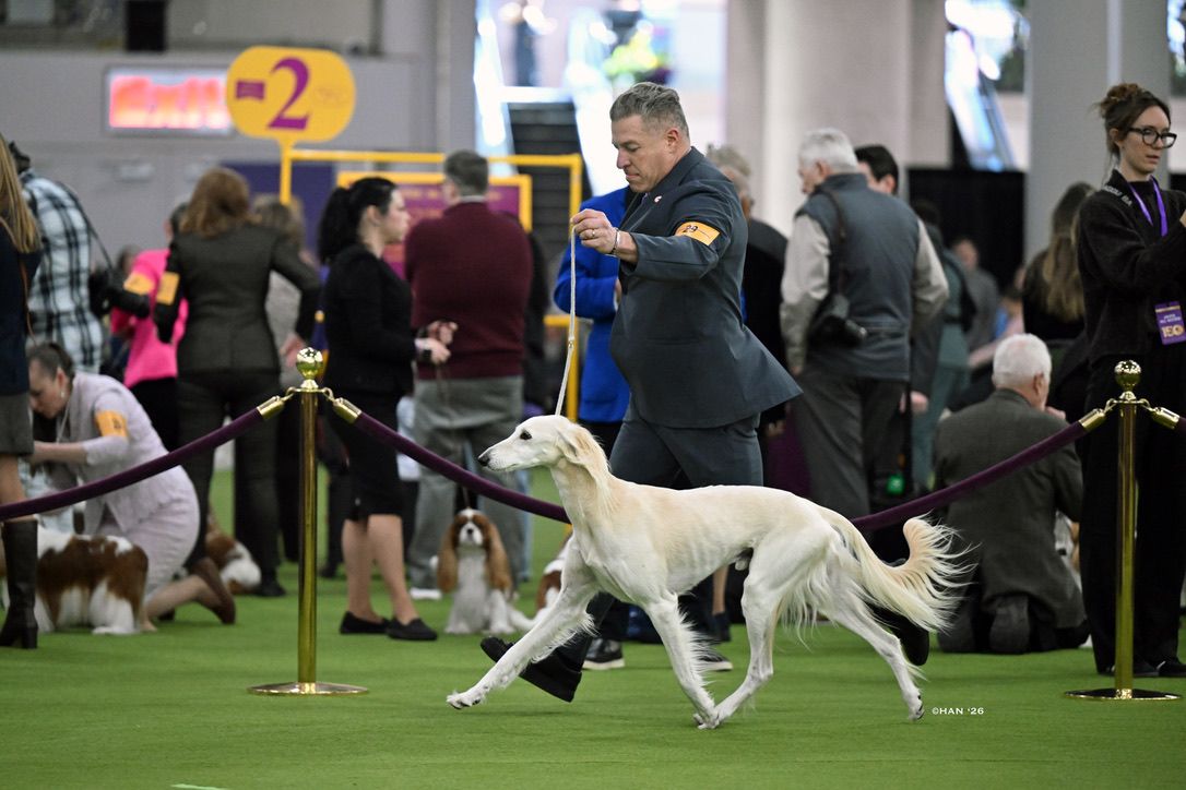 Since then, Kaspian has gone on to win many Specialty Best of Breeds and an all breed Best in Show and was the number one male saluki in the US in 2025 — as a veteran no less! In February of 2026, Kaspian was Best of Breed at the Westminster Kennel Club under breeder judge David Miller and then went on to win Group 4 under Michael Canalizo — under the lights at Madison Square Garden, one of the greatest thrills and honors ever!