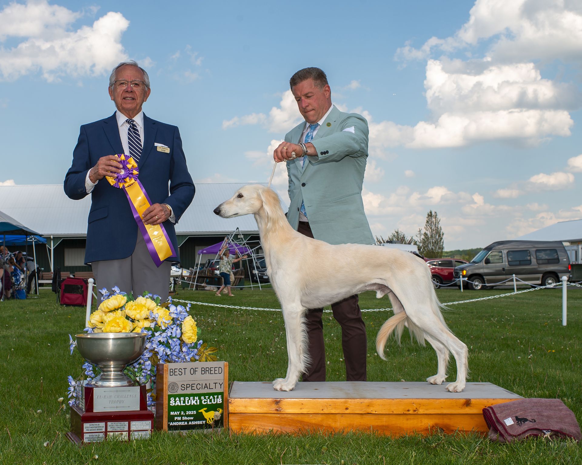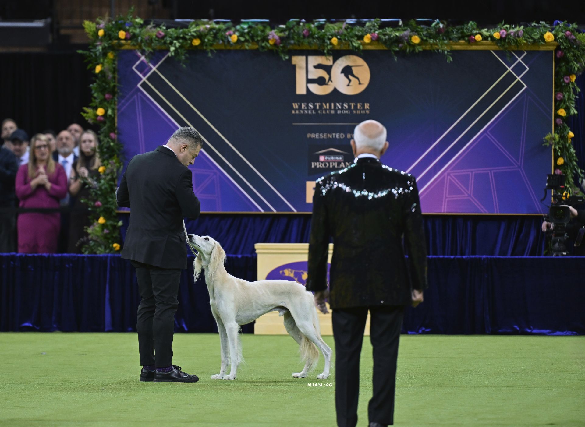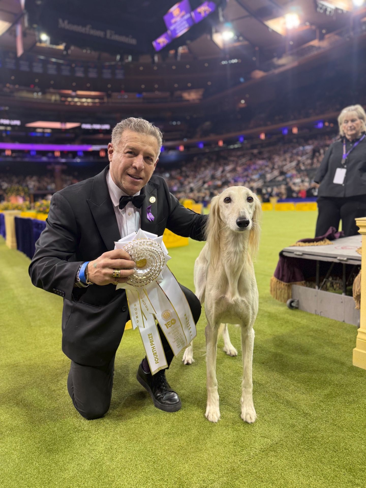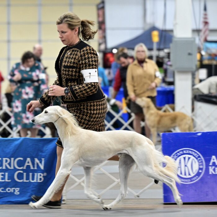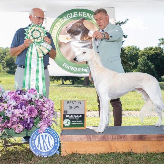 Since then, Kaspian has gone on to win many Specialty Best of Breeds and an all breed Best in Show and was the number one male saluki in the US in 2025 — as a veteran no less! In February of 2026, Kaspian was Best of Breed at the Westminster Kennel Club under breeder judge David Miller and then went on to win Group 4 under Michael Canalizo — under the lights at Madison Square Garden, one of the greatest thrills and honors ever!